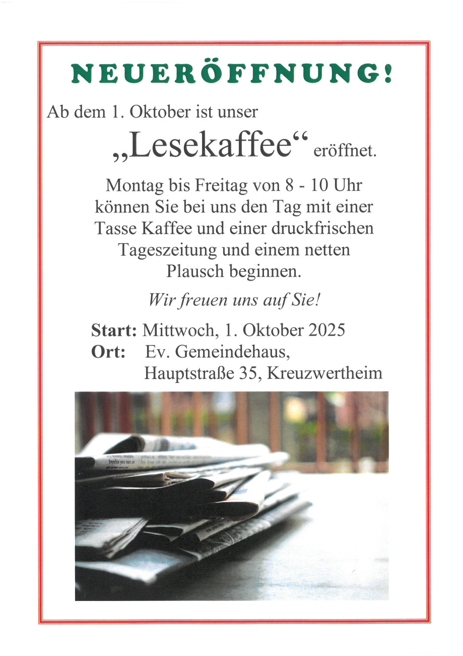 Ab 1. Oktober 2025 starten wir unser Lese-Kaffee. Immer von Montag - Freitag von 8.00 - 10.00 Uhr