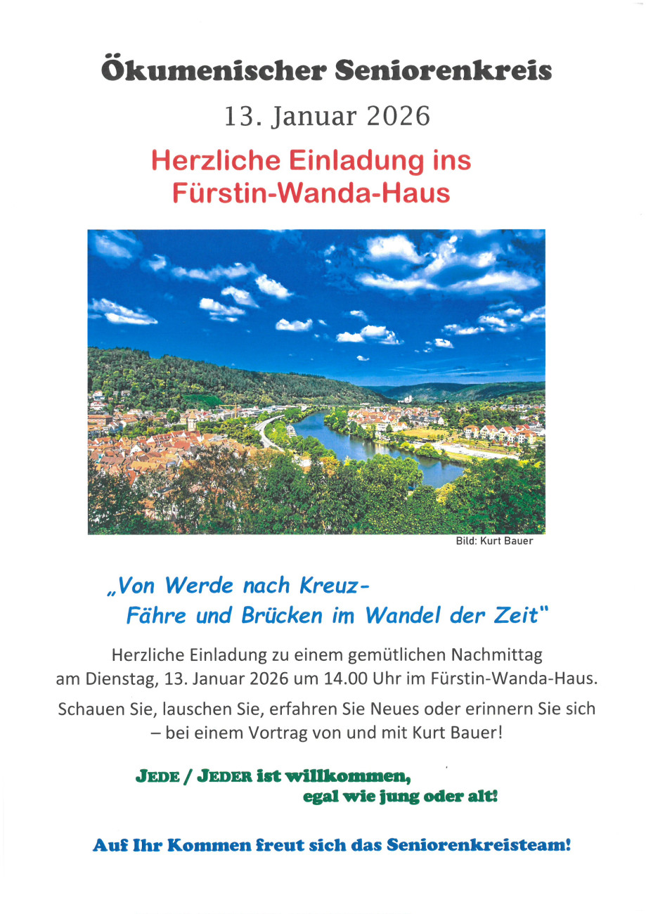 Herzliche Einladung des ökumenischen Seniorenkreises Kreuzwertheim zu einem gemütlichen Nachmittag am Dienstag, 13. Januar 2026 um 14.00 Uhr im Fürstin-Wanda-Haus.